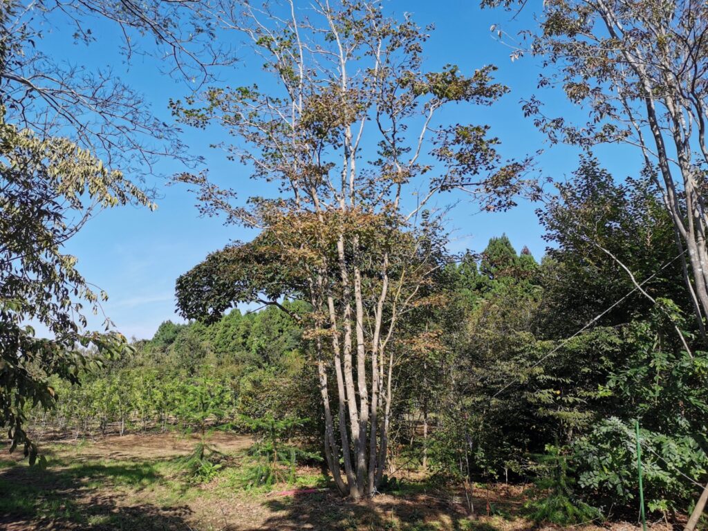 当社では、植木の規格ものを取り扱う業者とは異なり、福島県の阿武隈高地の山々に自生する木を掘り取りした「山採りもの」を扱います。市場で高値で売り買いされる人気のモミジアオダモをはじめ、アカマツやソヨゴ、ナナミノキなど50種ほどの植木を取り扱っています。